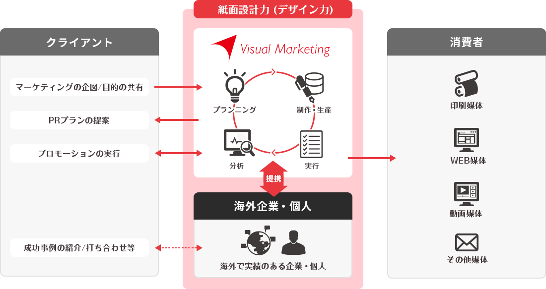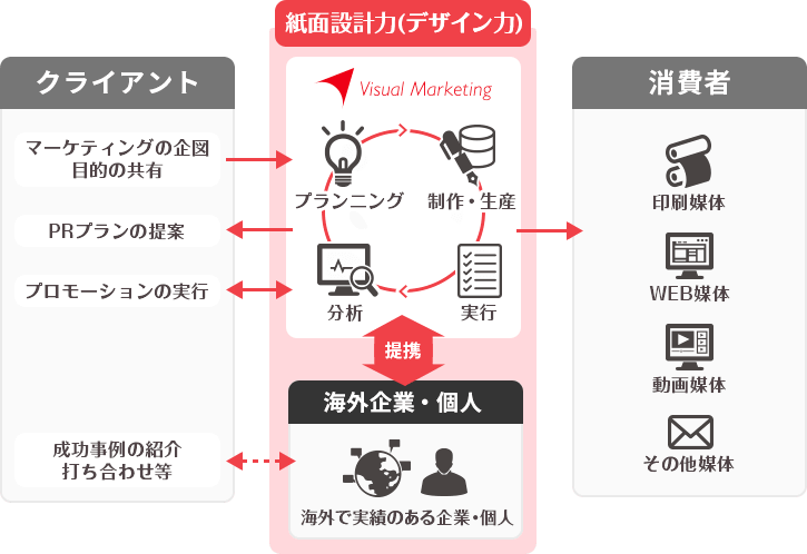 お客様の持つ顧客データベースを分析し、プランニングから実行までを行います。クリエイティブの成功事例が豊富な海外市場における企業・個人との提携をベースに、紙面設計力(デザイン力)を強みとした中長期的なプロモーションパッケージを提供します。